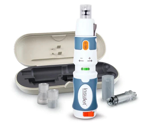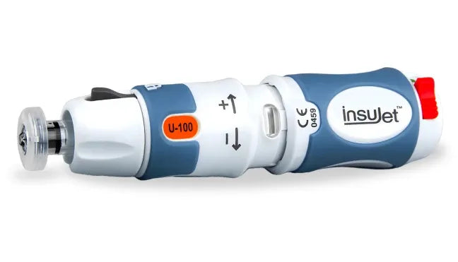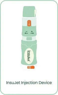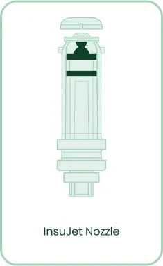 Insujet Nozzle. The Nozzle holds the insulin. A tiny orifice allows for a needle-free jet injection. The nozzle should be replaced after 56 injections, or after two weeks, whichever comes first.