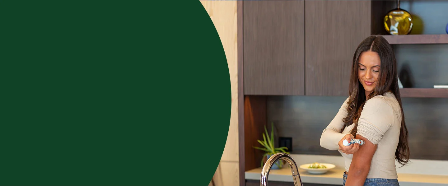 Safety lock. Slide the red safety catch to the side and hold it there to unlock the safety release system. The device will now inject when the nozzle is pushed against your desired administration area.